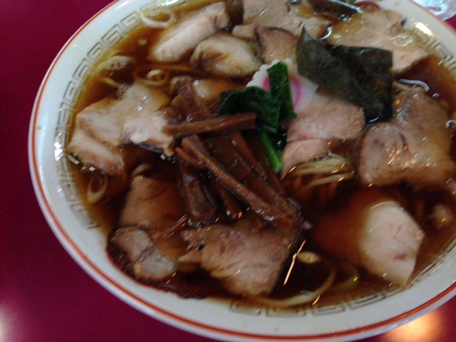 月曜定休。カウンター8席・テーブル4・小上がり4テーブル。お肉屋さんのラーメンとトンカツのお店。食券器でチケット購入。馬高ラーメン800円馬高満足ラーメン<大盛>700円チャーシューメン750円みそラーメン700円その他、トンカツ定食、ヒレカツ定食、チキンカツ定食、焼肉定食など。お肉屋という事で、チャーシューメンを選択。ナルト・ネギ・青菜・海苔・メンマ・味玉半分・削ぎ落し肩ロースとモモ肉チャーシュー数枚。中太麺、茶濁色の不思議な味のスープ。甘み・焦がし味・生姜のわずかな香り・やや塩っぱめの醤油スープに少しの背脂。メンマの味付けも濃いし、全体的に好みが分かれそうな一品。