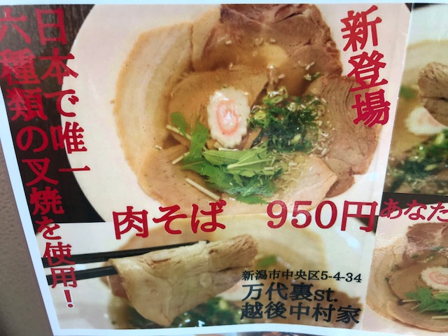 新登場の肉そば、6種類の部位(豚とろ・バラ肉・肩・ウデ・モモ・ヒレ)を使ったチャーシュー6枚がトッピングされたベースは中華そば、大盛無料だが普通で!ただただチャーシュー好きの私の嗜好と違ったチャーシューでした。産地も含めて切り置きしているから空気に触れさせている時間が長いのかなぁ?