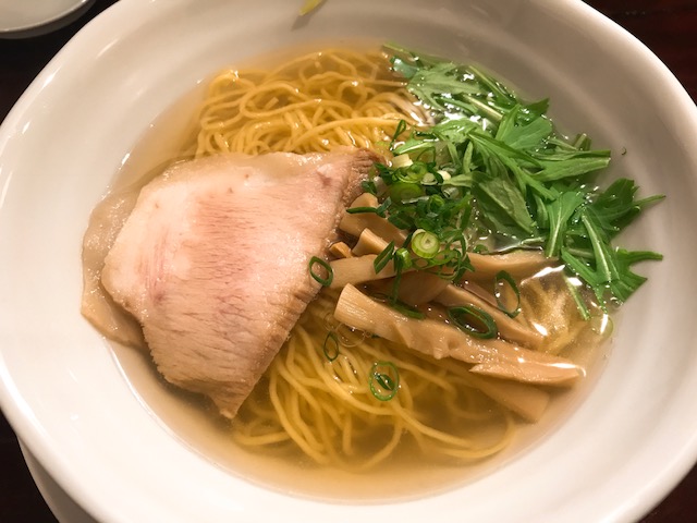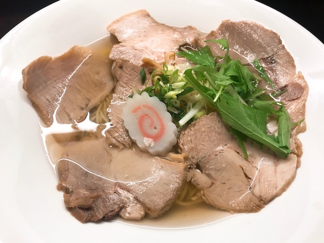 水曜定休、11:30~14:00.18:00~23:00。今のところカウンター5席(後ろにテーブル席出来るスペースあり)黒い調理服を着た店主一人で切り盛り。全ての調理が火を使わないI.H.調理。着座すると温かいお茶と沢庵の漬物が出てきて、カウンターに付いた引き出しの中に箸や爪楊枝・醤油・胡椒などが入っている。メニューはあご出汁らーめん850円と中華そば780円の2種中華そばと鶏飯セット950円があるのみ大盛無料。あご出汁らーめん(塩)は小葱・細メンマ・水菜・薄味付けで肉の旨味を感じる食感のある肩ロース?腕肉?チャーシュー2枚、食感ある縮れ細麺、透き通った超あっさり塩スープだが飛魚出汁や魚介はそれ程主張せずバランスの良い美味しいスープ。大盛無料なので大盛にしたが(こういう系で大盛も珍しい)ペロリと食べるられスープも完飲!大食いにはきっと物足りない。駐車場が無く、近くのコインパーキングで最低プラス200円になってしまうのが難点。
