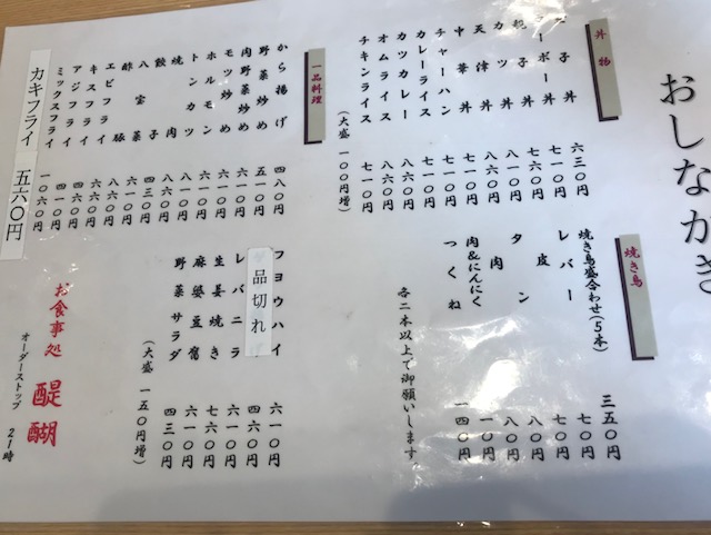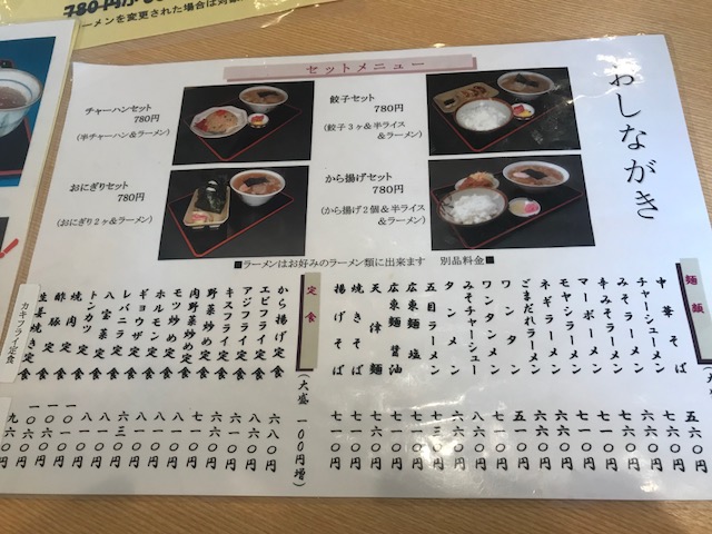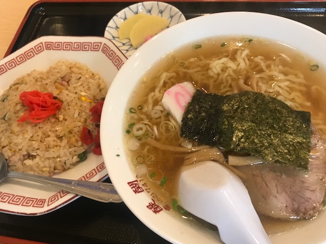 水曜定休、11:00~21:00。カウンター4席・テーブル5・小上がり3テーブル・個室小上がり2部屋。昨年(2017)改装されて綺麗でした。メニューは食堂らしく、麺類から定食・丼物・一品料理などなど品数が凄い!木曜なんでラーメンが付いた4つのセット通常780円が600円で食べる事が出来、大盛況。多くの方がチャーハンセット(半チャーハン+ラーメン)を頼んでました。ラーメンはナルト・海苔1枚・メンマ・小葱・チャーシュー1枚、麺は意外と<懐かし系だと業務用スタンダード麺の軟茹でと思いきや>しっかりした食感のツルツル多加水で喜多方麺をちょい細めにしたような縮れ麺、スープは今どきと違い油の少ないやや透明懐かしい中華醤油スープ。チャーハンは中華料理店の王道をいくタイプ。どちらも中華旨味調味料たっぷりのラーチャンの古き懐かしいタイプの最高峰かも。