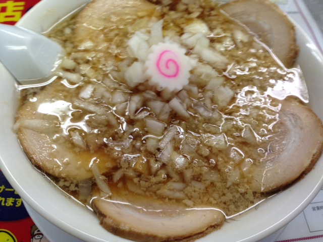 前回来たのがオープン当初の2007年になってます、街中で駐車場がないのでなかなか機会がありませんでした。役所に用事があり久々の来店。増税後もほぼ値上げなし!らーめん650円煮玉子らーめん750円メンマらーめん800円チャーシューめん850円チャーシューメンマらーめん1,000円全部入りらーめん1,100円、大盛100円増し特盛200円増し。他にカレー650円チャーハン550円、4月~9月の焼きそば700円つけめん700円夏の冷やし中華800円もある。基本は煮干しの効いた背脂醤油ラーメンで、ナルト・メンマ・玉ねぎ・やや厚めのチャーシュー5枚、やや軟らかめに茹でられた極太平打ち麺、煮干し感は強いが醤油感が弱い超マイルド燕系といったスープ。市役所の前からか時間が無い人の為に細麺選択や出前もある。今は無い横越の店もスープが薄かった、濃いめに頼めるのだろうか?常連さんに親しまれているお店です。