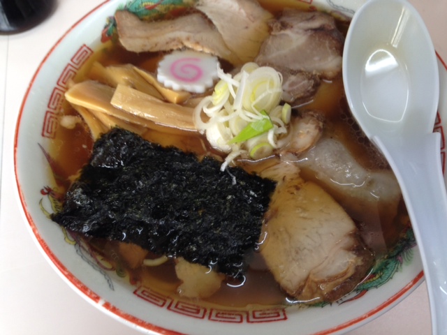 昔ながらの典型的なラーメン。オープンキッチンで見えるのに食品添加物<粉末かんすい>や化調をどうどうと見せている。ギンギンの昔ながらの化調の効いた支那そばです。安くていいのですが、チャーシューも味が出きったものになっているのが残念ですが、典型的な麻薬ラーメンですな。