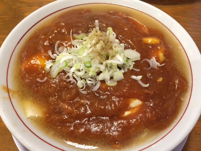 日曜昼2時半近くで目的の2店舗にフラれ(時間や麺売切れ)たどり着きました。人気と言われる「マーボーめん」を初トライ!」辛さは3段階から選べるとありましたが、何も聞かれなかったので、多分普通。写真ではもっと濃い色で挽肉タップリに見えますが、オレンジ色で挽肉は少な目で餡が多いタイプでした。ラーメンに麻婆豆腐をかけたタイプの麻婆麺。