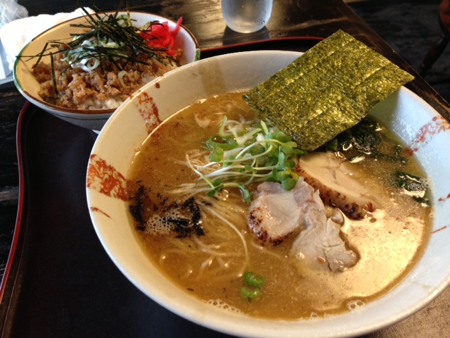 S君の紹介で行ってきました。本来、鶏鍋・鶏そば「つか乃間」という店名で、鶏鍋を売りにする居酒屋です。ランチ限定新メニューの鶏白湯ラーメンと勧められるがまま鶏そぼろ丼をオーダー。麺は、カイワレ・海苔1枚・ワカメ・青菜・ネギ・鶏チャーシュー2枚・焦がしネギ、白っぽいストレートに近い細麺、後で膜をはる鶏脂、鶏白湯に混ざる焦がしネギ味の醤油!?味の不思議なスープ。結構塩分高めで後で喉にキリキリきちゃうかな?!でもなかなかない味のスープです。麺はちょっと残念かな!?鶏そぼろ丼は小丼の割にボリュームあり、但しちょっと回転率が悪いのか?タッパー臭が・・・夜のメニューを見ましたが、炙りとろろサーモン丼・チキンカツカレー・おにぎりのメインから半身揚げ・タレカツチキン・刺身・焼き物・煮物・サラダと居酒屋メニューも豊富。メインの鶏鍋・鶏すき焼き鍋・鶏炒め鍋も1人前680円~と興味深々!今度鶏好きのS君と一緒に夜おじゃまします。ランチでもファイヤーポッポラーメン(辛)750円やシンプルな鶏そばに期待!