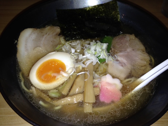 今年(2013)9月にオープンしたお店。水曜定休、カウンター7席、テーブル3.広いスペースだが節電の為か?薄暗い印象。食券を購入。基本は鶏ガラとゲンコツに煮干しや昆布の魚介ダシ、櫻ラーメン600円・Wラーメン650円(前述に白醤油)・AGラーメン700円(前述+トビウオを乾燥させたアゴダシ)・味噌ラーメン700円・つけ麺800円。チャーシューは各200円増し。カレーや豚汁定食、どんぶり、ラーメンに合せたミニ丼もある。初来店なので、櫻ラーメンにしようと思ったが、AGラーメンが自慢の一杯!とあったのでそれに。桜の形のかまぼこ・ねぎ・メンマ・海苔1枚・絹サヤ・味玉半分・薄いが美味しいチャーシュー2枚(見た目はマズそうなのに美味しい!)、やや硬茹での中麺、スープは凄い飛魚ダシが効いている!やや塩分高めだが美味い!酒田ラーメンは、老舗のお店がほとんどアゴダシだが、香る程度で優しい醤油味といった感じだが、こんなに飛魚ダシを効かせたラーメンは珍しい!ベースのスープに小鍋で、後から飛魚を煮出したスープを足している。飛魚は、高級ダシながら、好き嫌いが分かれるので、飛魚ダシ好きは是非このAGラーメンを!他のメニューも気になります。大変美味しかったです。ただアッサリに見えて塩分高いので喉のキリキリ感は結構後をひきます。