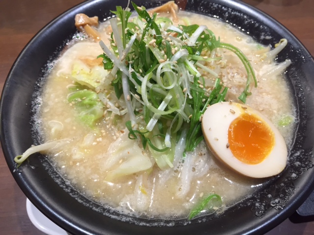 二回目の来店。値上げにつき、メニュー更新。魚介豚骨しょうゆ680円豚骨しお680円しろみそ野菜820円辛みそ野菜880円つけ麺(豚骨魚介スープ)820円(海老豚骨スープ)880円、それぞれ味玉増し110円炙り焼豚増し250円野菜増し110円など、他にセットメニューやクリーミィトマトチーズらーめん800円や健菜白ごまらーめん780円など。しろみそ野菜は、味玉半分・メンマ・もやし・玉ねぎ・キャベツ・水菜・白髪葱・煮豚片数個、麺は柿ポリフェノール入りのビラビラツルツル麺、白胡麻にスープは豚骨ベースの白味噌、油分があって濃い味だが、白味噌の優しく甘めの美味しいスープ。メニュー構成も店内も、立地も含めて女性率の高いラーメン店。