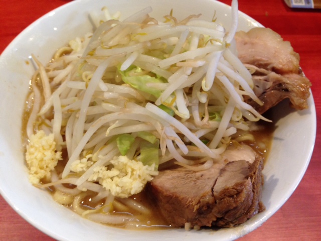 2014.9・21オープンした黄色い看板でお馴染みラーメン二郎!インスパイア系とかなんちゃら系でなく、本家三田本店の愛弟子がオープン!オープン間もない事もあり、大行列で1時間待ち!月曜定休(第3日曜定休)平日11:00~14:00、17:00~21:00、土日祝11:00~18:00.カウンター15席(小上がりがあるが今現在未使用状態)入口の店外に黄色い自販機があり黒烏龍茶をゲット!店内に持ち込めます。店内の食券機でチケット購入、小ラーメン650円小(豚入り)800円大ラーメン750円大(豚入り)900円。行った時点では、肉入りは品切れランプが。3人で運営してました、店主は時折長い棒でスープをかき回す。「帰りにはどんぶり・コップをカウンター上段に上げ、テーブルを拭いて」の張り紙。プラスチックの食券を出すとしばらくしてお馴染みの「にんにく入れますか?」の声。野菜や脂の量をリクエストしている人もいた。選んだ小ラーメンは、もやし・キャベツ・脂身多い分厚いトロ肉チャーシューと赤身多めの2枚というか2塊!固ゆででメッチャ旨い太麺、それに対抗すべく豚骨ベースの醤油濃い味(しょっぱい!)そしてにんにくと背脂。ラーメンというより、スープは濃すぎて飲めないので、つけ麺に近い感じ。まああの時代にこのラーメンを考案し勝負したんだから凄いと思う。