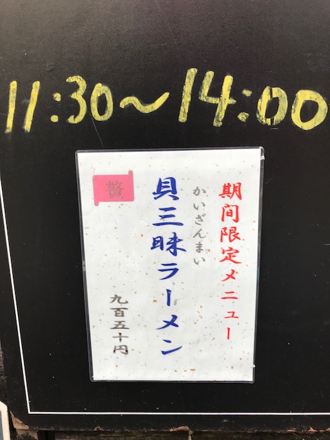 今回食べた品:昼ランチ15杯限定 貝三昧ラーメン950円(大盛無料)+煮干し飯10円