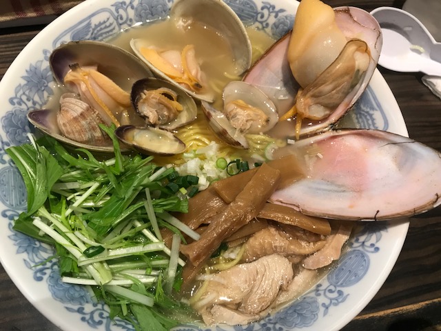 浦咲のランチバージョン「昼ごはんこんごう」にて15杯限定で貝のラーメンをやってるとの情報を得て、行かねばと思い行って来ました。大盛・特盛無料にて大盛そしてそのスープを入れて食べられる煮干し飯がなんと10円!で。水菜(どうも水っぽくなるから三つ葉がありがたいけど)メンマ・鶏チャーシュー3片・大きな北海道産白貝1個・大きめ千葉産白蛤2個・千葉産活浅利2個、なんと国産3種の貝とは贅沢!黄色っぽい多加水細麺、小鍋におおもとのアゴ出汁塩ベース(これ自体が味が濃く美味すぎ!?)を入れて貝を開かせたスープ。いや~貝好きには堪らないラーメンです。満席だったので「貝三昧は少々お時間頂きます」と言われ全然待つのは構わなかったのだが、貝がなかなか開かないのか開くために悪戦苦闘してました(蓋をすればすぐ開くんだけどな)貝が開いてすぐ提供されたのでスープに貝出汁がそれほど染み出てなくそれ自体が旨味がある絶品スープに滋味深い貝出汁はそれほど染み出ていませんでした。そのかわり貝を食べると貝自体はすごく味がしっかりしていました。どちらが好きか好みだと思いますが。10円で追加出来る煮干し飯にスープをかけて温くなってるけどこれも嬉しい。