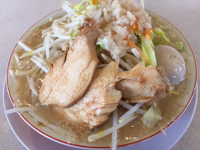 年中無休、11:00~15:00.17:00~22:00。カウンター7席・テーブル3・小上がり3テーブル。メニューは中華そば680円白味噌800円つけめん800円焼肉醤油800円焼肉なおじろう900円焼肉味噌880円なおじろう690円など、それぞれ味玉、チャーシュー、スペシャル、野菜増し、大盛などがある。なおじさんの提供するラーメンがシエ以来私の好みと路線が変わってきたので、遠ざかってきましたが、クーポンがあったので、V3に初来店。自販機でチケットを買う、クーポン用の500円チケットがある(メールなどでいつでもこのサービスはあるみたい)カウンターのど真ん中にTVがあるが、目の前で近過ぎる(笑)テレビではなくラーメンに関わるDVDを流している。味玉1個・人参・キャベツ・大量のもやしなどを茹でたもの、背油・メンマ・ネギ・ニンニク、鶏チャーシュー3枚、角の無い極太麺、鶏がベースで醤油味だが、ニンニクと背油で鶏はほとんど感じない。普段はなおじろうは豚骨ベースらしいが、このラーメンにはやはり豚骨ベースの方があいます。じろうがつくから想像はできたけど、もやし&にんにく、濃い味カエシに背油というガッツリボリュームタイプでした。